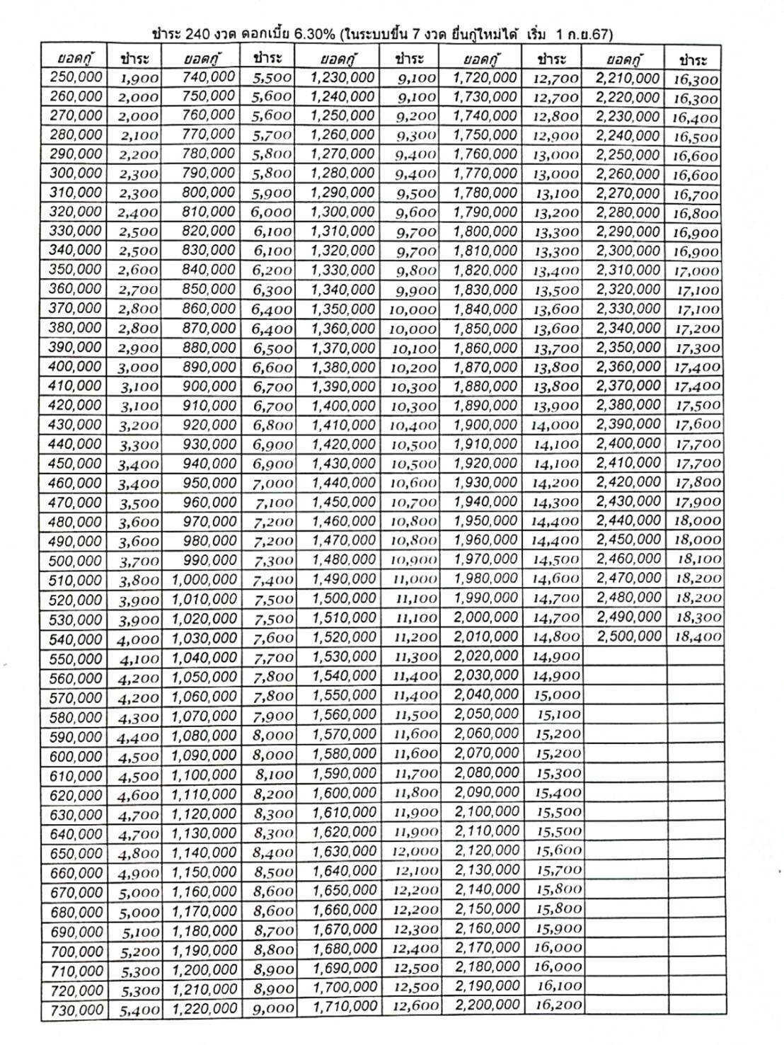 ตารางชำระ 240 งวด ดอกเบี้ย 6.30%